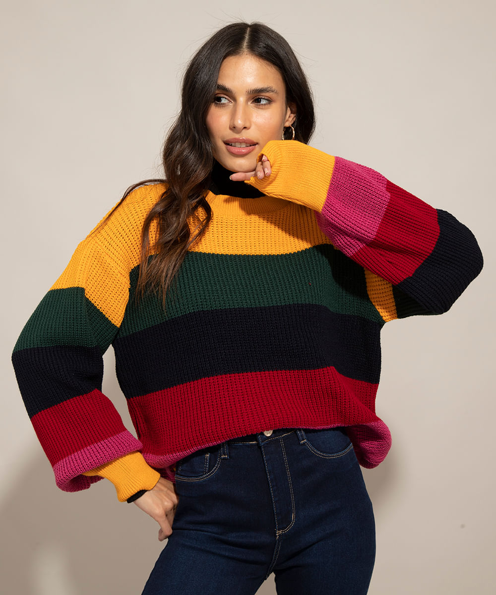 Suéter feminino desenvolvido em tricô com listras coloridas. O modelo tem caimento amplo, manga longa e decote redondo. Os acabamentos dos punhos, barra e decote são canelados.