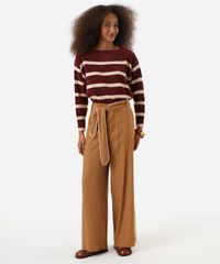 Suéter feminino confeccionada em tricot chenille de toque macio e aveludado com padronagem listrada. A peça tem a modelagem e construção reta e o caimento é confortavelmente solto ao corpo. O modelo tem decote redondo e mangas longas. Possui acabamento canelado nos punhos e na barra.
