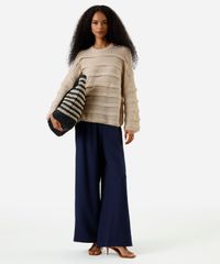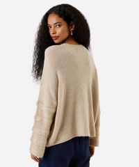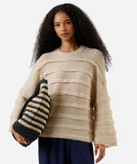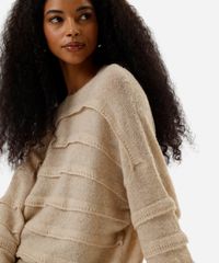 Suéter feminino confeccionado em tricot felpado com poliamida. A peça tem a modelagem reta, caimento solto ao corpo e babados aplicado nas parte frontal. O modelo tem gola redonda e mangas longas com ombros deslocados e punhos amplos.