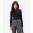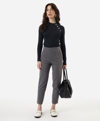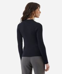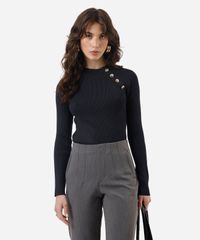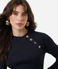 Suéter feminino confeccionado em tricot com textura canelada. A peça tem a modelagem e construção reta e o caimento é ajustado ao corpo. O modelo tem gola redonda e mangas longas. Possui botões decorativos aplicados.