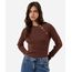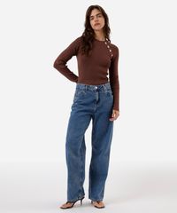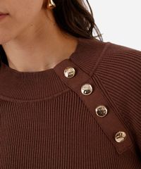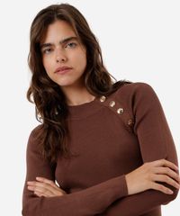 Suéter feminino confeccionado em tricot com textura canelada. A peça tem a modelagem e construção reta e o caimento é ajustado ao corpo. O modelo tem gola redonda e mangas longas. Possui botões decorativos aplicados.