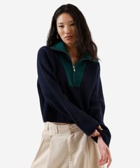Suéter feminino confeccionada em tricot com toque macio e textura canelada. A peça tem a modelagem e construção reta, caimento solto ao corpo e recorte em tom contrastante. O modelo tem gola alta, abertura por zíper parcial e mangas longas.