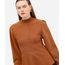 Suéter feminino confeccionada em tricot com viscose e poliamida. A peça tem a modelagem levemente acinturada com barras amplas. O modelo tem gola alta e mangas longas bufantes com pregas nos ombros. Detalhe de acabamento canelado nos punhos e gola.