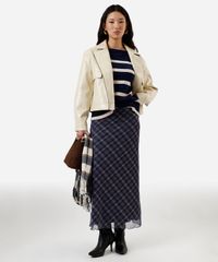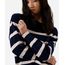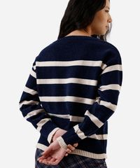 Suéter feminino confeccionada em tricot com toque macio, leve brilho e padronagem listrada. A peça tem a modelagem e construção reta e o caimento é confortavelmente solto ao corpo. O modelo tem gola redonda e mangas longas. Detalhe de acabamento canelado nos punhos e na barra.