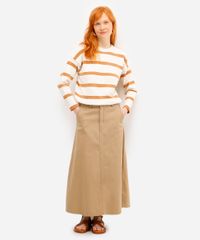 Para um visual casual e moderno, combine este suéter listrado com uma calça jeans de sua preferência e um tênis. Se a ideia é um look mais elaborado, aposte em uma saia longa de sarja, como a da foto, ou uma calça de alfaiataria, finalizando com botas ou mocassins. É uma peça-chave que transita facilmente entre diferentes estilos.