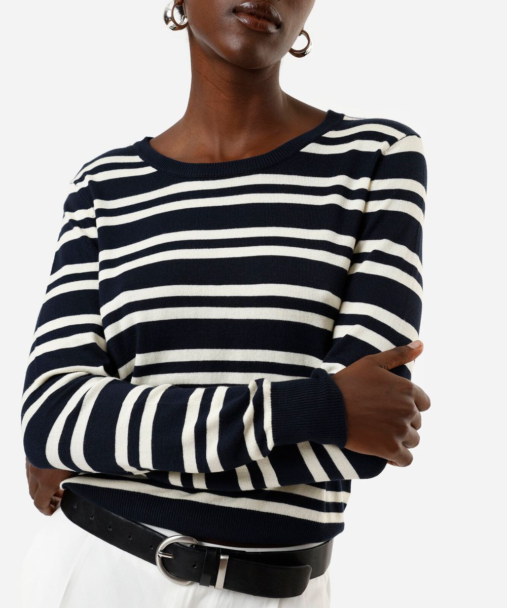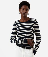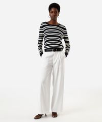 Suéter feminino confeccionado em tricot leve de viscose com padronagem listrada. A peça possui gola careca, mangas longas, caimento levemente solto e reto ao corpo e acabamento canelado. Composição: 80% viscose 20% poliamida Modelo veste: P Medidas da modelo - Altura: 1,73m Busto: 86cm Cintura: 70cm Quadril: 101cm. Instruções de lavagem: - Lavar à mão - Proibido o alvejamento - Não secar em tambor - Secagem em varal por gotejamento - Não passar - Não lavar à seco - Limpeza à úmido processo normal