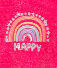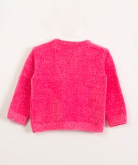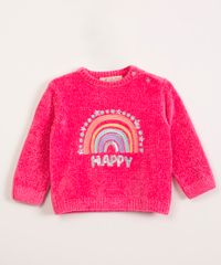 Suéter infantil confeccionado em chenille. O modelo tem mangas longas, decote redondo com acabamento simples, ajuste nos ombros por botão e bordado localizado na parte frontal com arco íris e paetês aplicados.