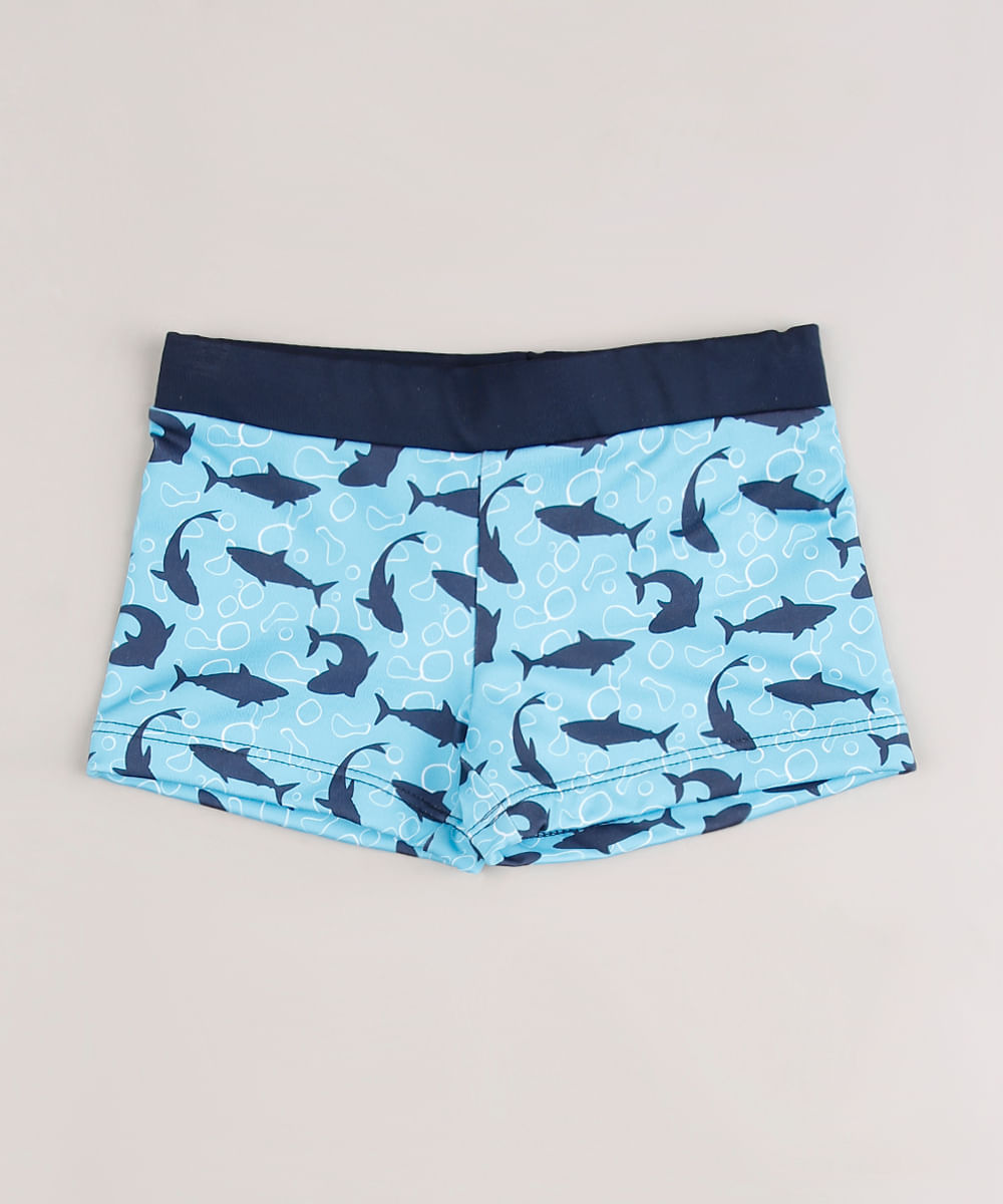 Sunga infantil confeccionada em malha com proteção UV50+. A modelagem é boxer, com pernas alongadas que se ajustam ao corpo. Possui estampa com tubarões no fundo do mar. O cós tem elástico e cordão para ajuste embutidos. Tem forro em malha na parte frontal.
