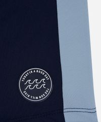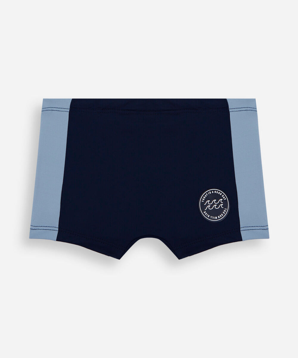 Sunga infantil confeccionada em malha de poliamida com proteção UV e tag emborrachada. A peça tem modelagem boxer, com laterais largas, maior cobertura posterior e recortes contrastantes laterais. Possui cós elástico com cordão para ajuste e forro em malha.
