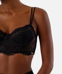 Sutiã feminino confeccionado em renda floral. O modelo é cropped, com caimento ajustado, sem bojos e com aros para melhor sustentação. Possui alças finas removíveis e ajustáveis, transparência e fechamento por colchetes com níveis de ajuste. Composição 90% poliamida, 10% elastano Modelo veste: P/38 Medidas da modelo: Altura: 1,80m Busto 79cm Cintura: 60cm Quadril: 89cm Instruções de lavagem: - Lavagem manual - Não alvejar - Não secar em secadora - Secar na vertical - Não passar - Não lavar à seco