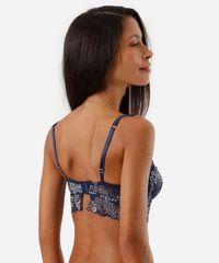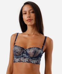 Sutiã cropped feminino confeccionado em renda floral. O modelo é meia taça, com caimento ajustado, sem bojos e com aros. Possui alças finas elásticas e reguláveis e o fechamento é na parte posterior por colchetes com níveis de ajuste.