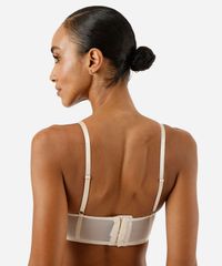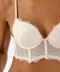 Sutiã cropped feminino confeccionado em renda com padronagem floral. O modelo é meia taça, com caimento ajustado, bojos, aros e comprimento alongado com barbatanas embutidas para maior sustentação. Possui alças finas ajustáveis e fechamento posterior por colchetes com níveis de ajuste.