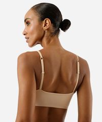 Sutiã feminino confeccionado em malha de poliamida. O modelo é faixa, com caimento ajustado, bojos removíveis e alças finas ajustáveis.
