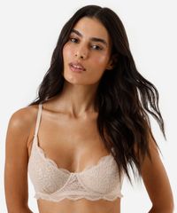 Sutiã feminino confeccionado em renda floral. O modelo é meia taça, com caimento ajustado, aros, forro em tule, alças finas ajustáveis. Possui fechamento posterior por colchetes com níveis de ajuste. Composição: 87% poliamida, 13% elastano Modelo veste: P/38 Medidas da modelo: Altura: 1,77m Busto 80cm Cintura: 60cm Quadril: 93cm Instruções de lavagem: - Lavagem manual - Não alvejar - Não secar em secadora - Secar na vertical - Não passar - Não lavar à seco