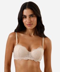 Sutiã feminino confeccionado em malha de poliamida e detalhes em renda. O modelo é meia taça, com caimento ajustado, aros, bojos fixos e alças finas ajustáveis e removíveis. Possui fechamento posterior por colchetes com níveis de ajuste.