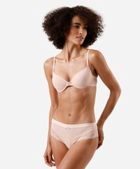 Sutiã feminino confeccionado em malha de poliamida e detalhes em renda. O modelo é meia taça, com caimento ajustado, aros, bojos fixos e alças finas ajustáveis. Possui fechamento posterior por colchetes com níveis de ajuste.