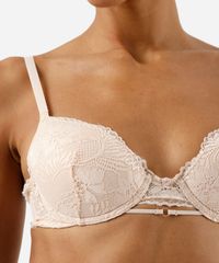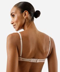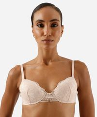 Sutiã feminino confeccionado em renda com padronagem floral. O modelo é meia taça, com caimento ajustado, bojos, aros para maior sustentação. Possui alças finas ajustáveis e fechamento posterior por colchetes com níveis de ajuste.