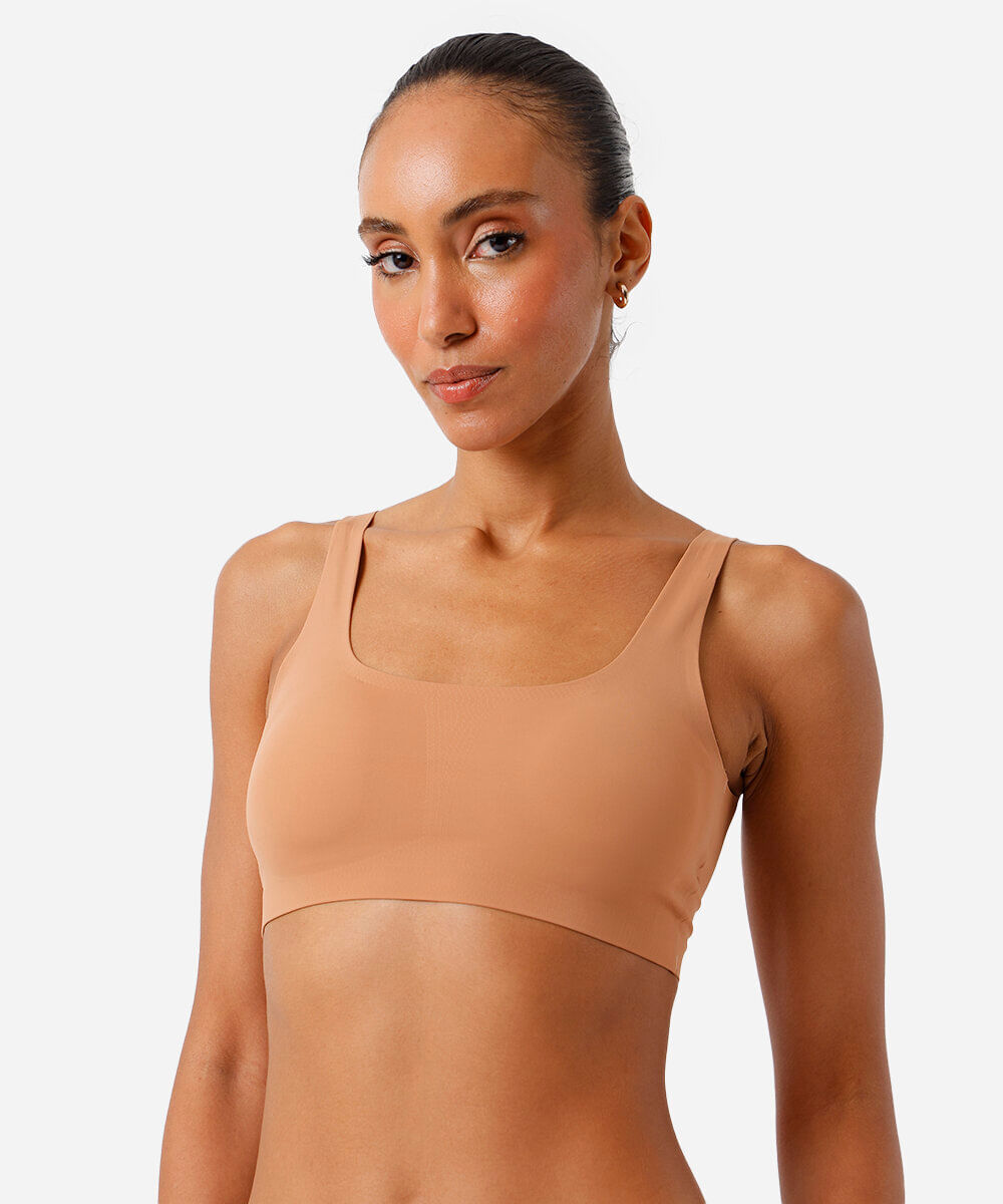 Sutiã top feminino confeccionado em malha de poliamida com elasticidade e toque leve. A peça básica com acabamento sem costura e tecnologia seamless, que proporciona uma superfície lisa e confortável sobre o corpo, reduzindo marcar sob a roupa causando um efeito invisível, possui modelagem cropped com caimento ajustado, decote redondo, alças finas e bojos removíveis.