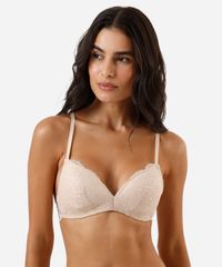 Sutiã feminino confeccionado em renda floral. O modelo é triângulo, com caimento ajustado, bojos fixos e alças finas ajustáveis. Possui fechamento posterior por colchetes com níveis de ajuste. Composição: 87% poliamida, 13% elastano Modelo veste: P/38 Medidas da modelo: Altura: 1,77m Busto 80cm Cintura: 60cm Quadril: 93cm Instruções de lavagem: - Lavagem manual - Não alvejar - Não secar em secadora - Secar na vertical - Não passar - Não lavar à seco