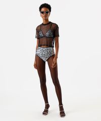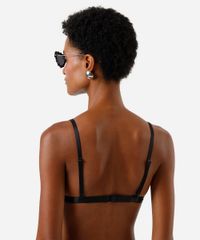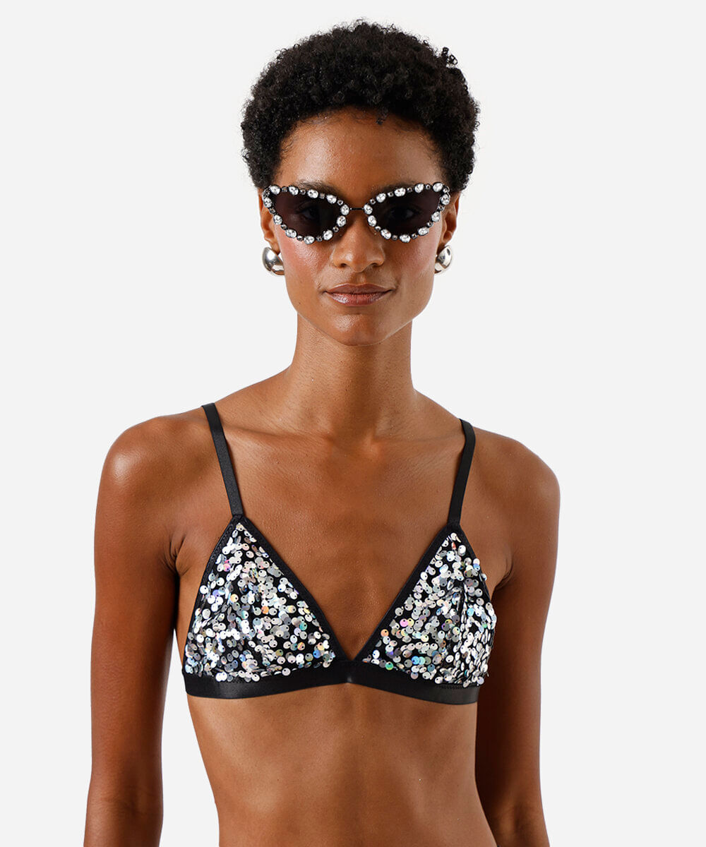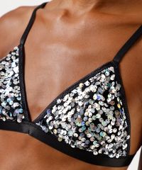 Sutiã feminino de carnaval confeccionada em malha bordada com paetês. A peça tem a modelagem triângulo com caimento ajustado ao corpo. O modelo tem decote V, alças finas ajustáveis e fechamento por colchete.