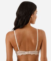 Sutiã feminino confeccionado em renda. A peça modelagem triângulo, com caimento ajustado, bojos removíveis e alças finas ajustáveis. O fechamento é na parte posterior por colchetes com níveis de ajuste.