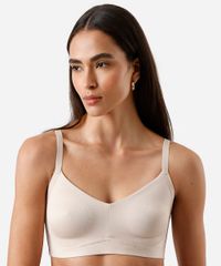 Sutiã feminino confeccionado em malha. A peça tem modelagem triângulo, caimento ajustado ao corpo, com bojos, alças elásticas ajustáveis e fechamento por colchetes com níveis de ajuste.