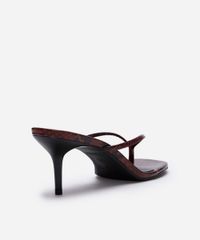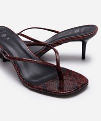 Tamanco desenvolvido em material sintético resistente com estampa animal print. O modelo tem bico quadrado, tiras finas no cabedal com apoio para os dedos, solado acolchoado e salto fino médio.