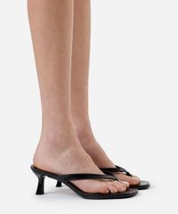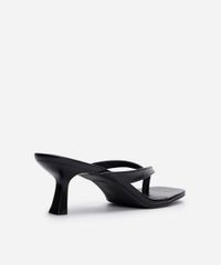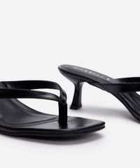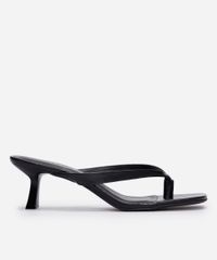 Tamanco feminino desenvolvido em material sintético resistente. O modelo tem bico quadrado e cabedal com tiras duplas e suporte para encaixar o dedo. Possui solado com leve enchimento e inscrição de marca e salto médio e fino. A sola é texturizada e auxilia no caminhar.