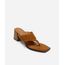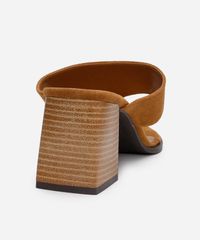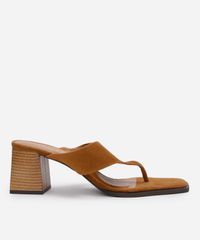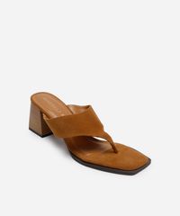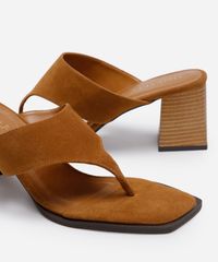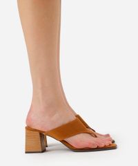 Tamanco feminino desenvolvido em material sintético resistente. O modelo tem bico quadrado e cabedal com tira larga e suporte para encaixar os dedos. Possui solado com leve enchimento e inscrição de marca, salto grosso e médio com efeito de madeira e sola texturizada que auxilia no caminhar.