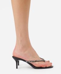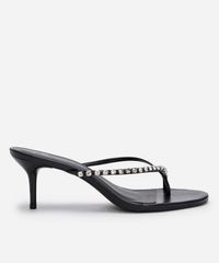 Tamanco feminino desenvolvido em material sintético resistente. O modelo tem bico redondo e cabedal com tiras finas com brilhos aplicados e suporte para encaixar os dedos. Possui solado com leve enchimento e inscrição de marca, salto fino e baixo e sola texturizada que auxilia no caminhar.