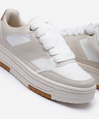 Este tênis flatform é extremamente versátil e transita facilmente entre diferentes estilos. Combine-o com uma calça jeans e uma camiseta para um visual despojado, ou com saias e vestidos para uma produção mais moderna e feminina. Ele também é o par perfeito para shorts de alfaiataria, criando um contraste interessante entre o formal e o casual.