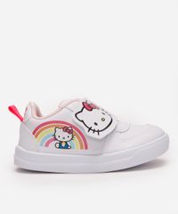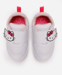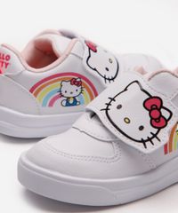 Tênis infantil confeccionado em material sintético resistente. O modelo tem bico redondo e cano curto, cabedal com recorte e tira larga com velcro e estampas localizadas da Hello Kitty. Possui forro com leve enchimento interno, palmilha macia e sola texturizada que auxilia no caminhar.