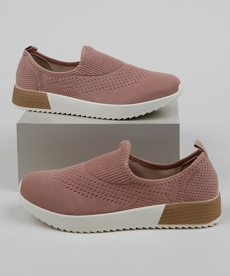 Tênis feminino desenvolvido em tecido sintético encorpado cujas tramas simulam a textura de crochê. O modelo running tem ar esportivo. O solado é emborrachado e levemente alto.