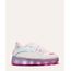 Tênis confeccionado em material sintético. O bico é redondo, o cabedal fechado com língua e tiras com velcro, detalhes coloridos e de corações, sola emborrachada com glitter e luz que ascendem ao pisar.