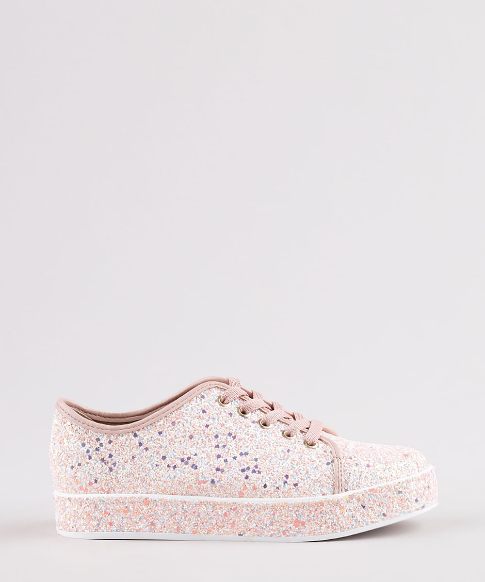 Tênis infantil feminino desenvolvido em material sintético e revestido em brilho. O solado flatform é alto. O fechamento é superior por cadarço. A palmilha é macia e a sola é emborrachada.