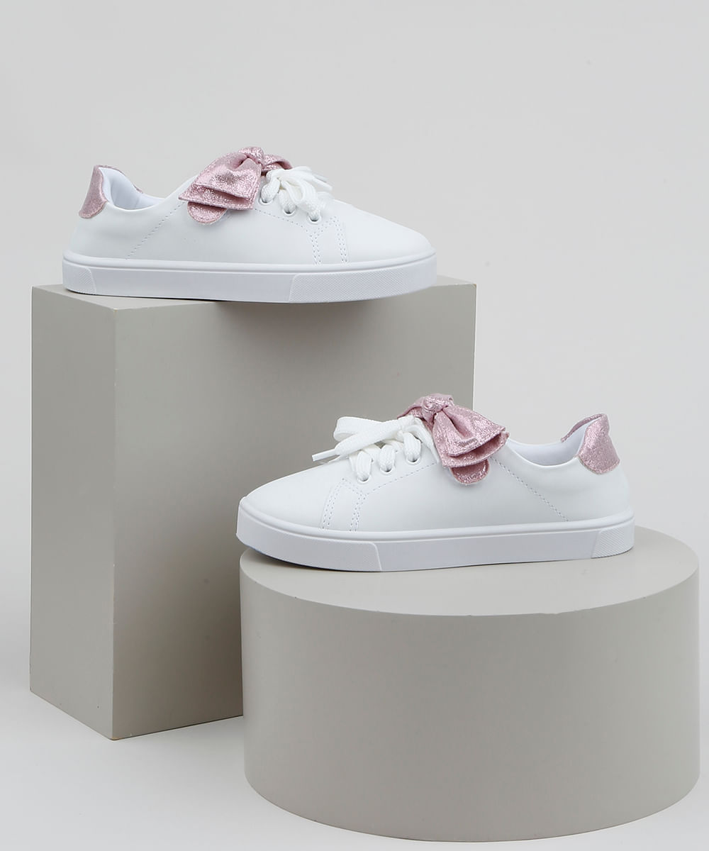 Tênis infantil desenvolvido em material sintético. O modelo possui língua almofadada e fechamento por cadarço e aplicação de laço com brilho. Possui detalhe de recorte na parte posterior na cor rosa. O solado é emborrachado. O interior é macio.