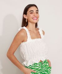 Top feminino desenvolvido em tecido plano acetinado com leve elasticidade. Possui aplicação de lastex, que confere caimento ajustado ao corpo. A barra forma leve babado, assim como as alças e o decote reto.
