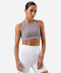 Top feminino confeccionado em malha encorpada canelada. A peça possui modelo cropped, decote nadador, alças médias, barra com elástico embutido, forro com bojo embutido, caimento confortavelmente ajustado ao corpo e acabamento pespontado.