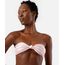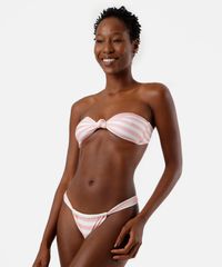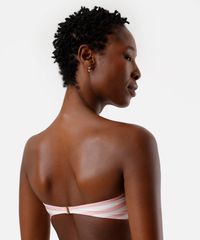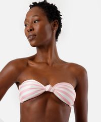 Top de biquíni feminino confeccionado em malha com padronagem listrada com proteção uv. A peça possui modelo sem alça, detalhe de nó frontal, forro, acabamento pespontado e fechamento posterior por encaixe de metal com banho dourado.