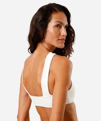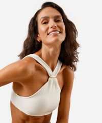 Biquíni top confeccionado em malha de poliamida texturizada com elasticidade e toque leve. A peça possui modelagem halterneck com detalhe de metal dourado posterior, alças médias e acabamento pespontado.