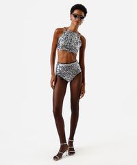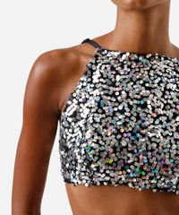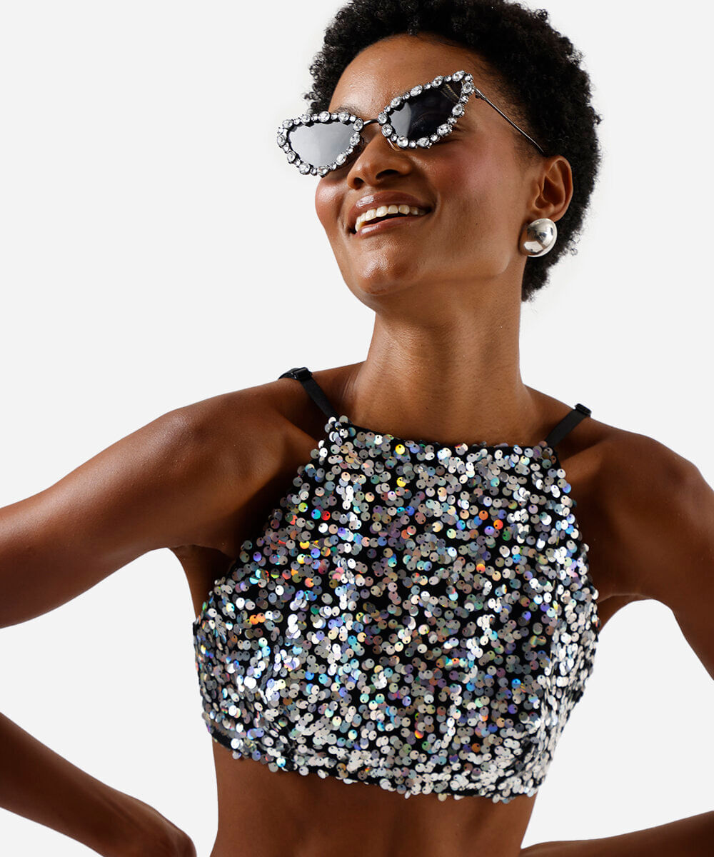 Top feminino de carnaval confeccionada em malha bordada com paetês. A peça tem a modelagem e construção reta e o caimento é confortavelmente ajustado ao corpo. O modelo tem decote halterneck, alças finas ajustáveis e forro em malha.