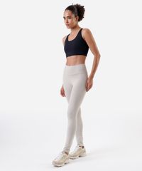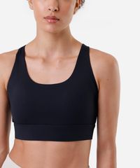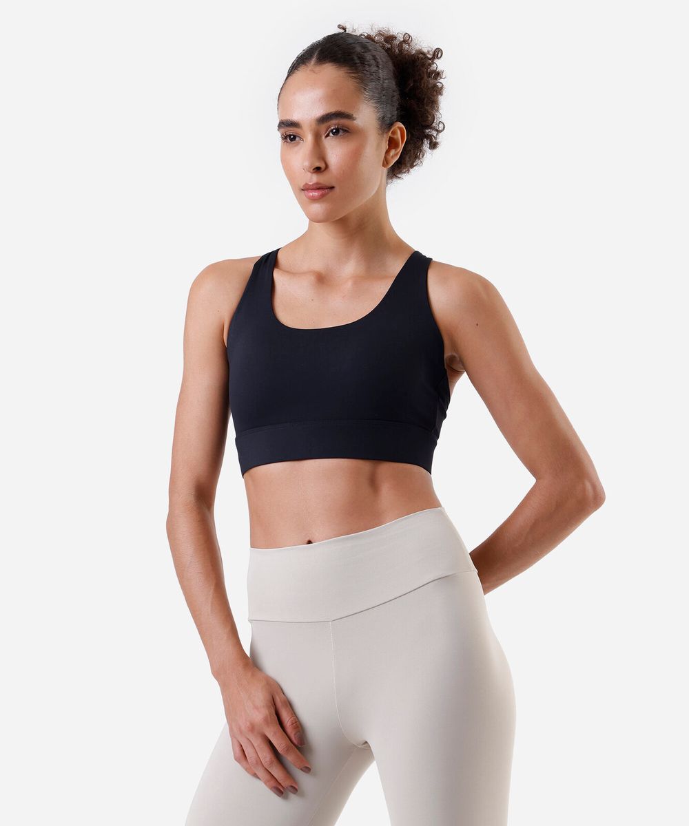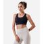 Top esportivo feminino confeccionado em malha de poliamida. A peça tem modelagem ajustada ao corpo com elástico embutido na base para maior sustentação. O modelo tem decote arredondado, alças finas transpassadas na parte posterior, e fechamento posterior por colchetes com níveis de ajuste.