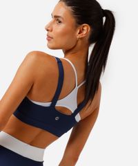 Top feminino confeccionada em malha de poliamida. A peça tem a modelagem e construção reta, caimento confortavelmente ajustado ao corpo com recorte contrastante que cria efeito de sobreposição. O modelo tem decote redondo e alças médias. Possui acabamento com forro em malha e elástico embutido na base.