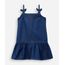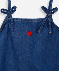 Vestido infantil confeccionado em jeans com bordado de coração. A peça tem modelagem evasê, caimento solto ao corpo e recorte inferior formando franzidos. O modelo tem decote quadrado, abertura posterior por botão e alças finas.