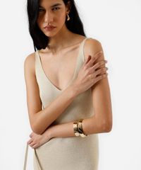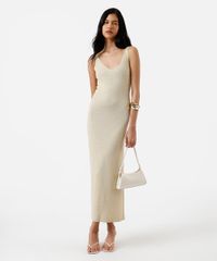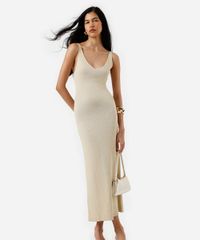 Vestido midi feminino confeccionado em tricot com fios de lurex que acrescentam brilhos. A peça tem modelagem evasê e caimento reto e solto ao corpo. O modelo tem decote V e alças finas.