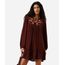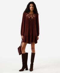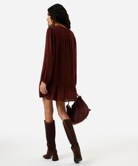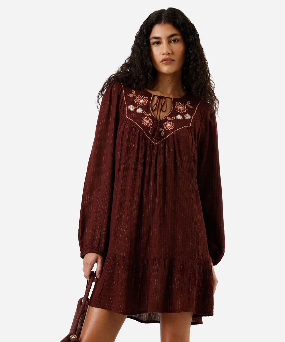 Vestido curto feminino confeccionado em tecido plano com viscose e fios de lurex que acrescentam brilhos. A peça tem modelagem estilo bata, com construção reta, caimento amplo e solto ao corpo com recorte inferior formando franzidos. O modelo tem decote redondo, com recorte bordado em floral, tiras finas para amarração com tassel nas pontas e mangas longas com elástico embutido nos punhos. Detalhe de acabamento pespontado na barra.