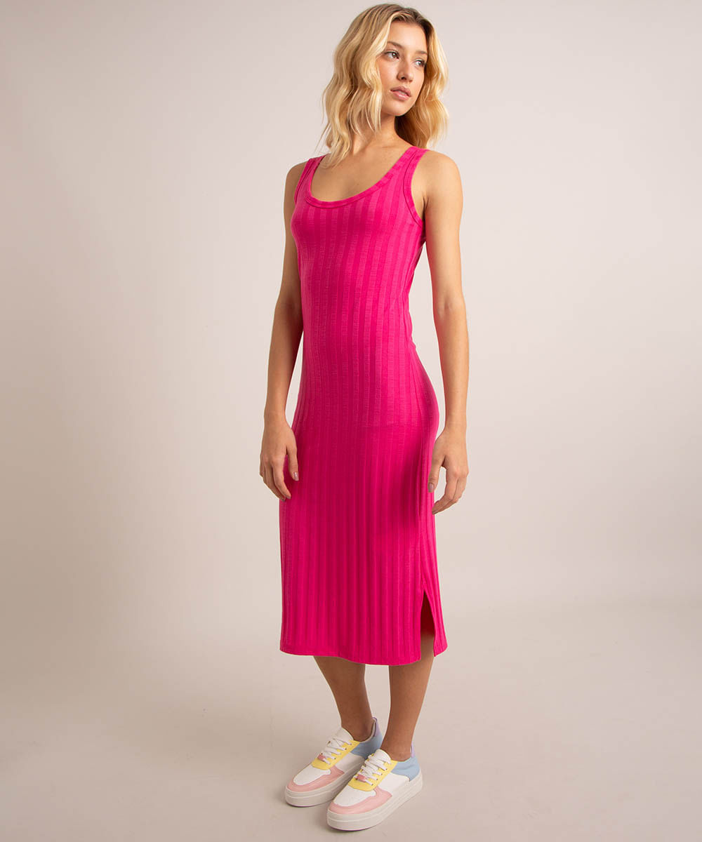 vestido canelado midi básico com fenda alça média decote redondo pink