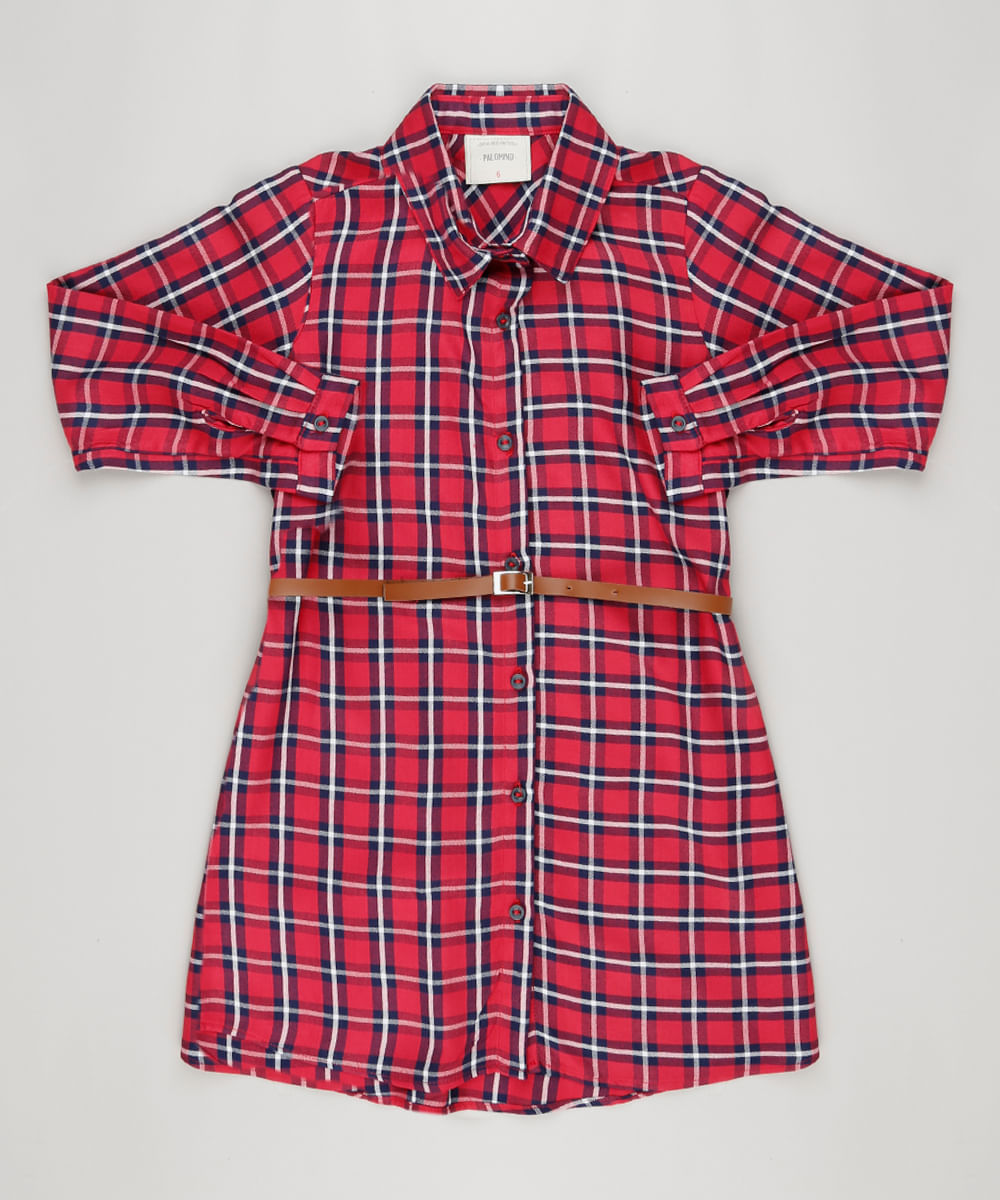 Vestido infantil confeccionado em tecido plano. A modelagem chemise te aspecto de camisa longa, com gola esporte e fechamento por botões. O charme é a estampa xadrez. As manga são longas. Acompanha um cinto fino com fechamento por fivela.