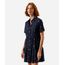 Vestido curto feminino confeccionado em tecido plano com linho e bordados estilo gravataria. A peça tem modelagem chemise, caimento rodado e solto ao corpo com recortes que criam efeito de camadas e formam franzidos. O modelo tem gola esporte, fechamento por botões e mangas curtas. Detalhe de acabamento pespontado na barra.