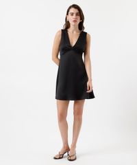 Para um look de festa ou um evento mais formal, combine este vestido acetinado com sandálias de salto fino e acessórios delicados, como brincos e uma clutch. Se a ideia é uma produção elegante para um jantar, experimente usá-lo com mules de salto bloco e uma bolsa tiracolo estruturada. A versatilidade da peça permite criar composições que vão do clássico ao contemporâneo.